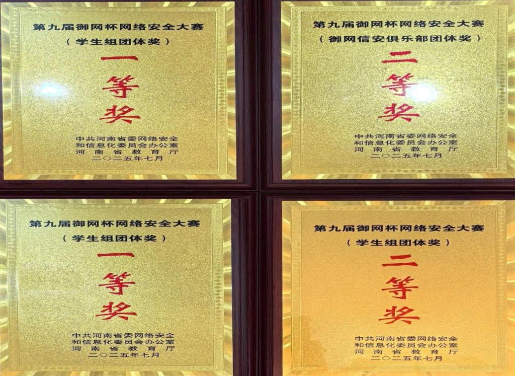 7月12日至13日,由河南省委网络安全和信息化委员会办公室、河南省教育厅联合主办,郑州轻工业大学等单位承办的第九届“御网杯”网络安全大赛在郑州成功举办。谈球吧app下载共组织由李学威、王晓菲两位老师指导的4支学生队伍参赛,12名参赛选手经过长达10小时线下决赛的激烈角逐和顽强拼搏,凭借扎实的网络安全防御与渗透实战能力以及沉着冷静的出色发挥,最终斩获团体赛一等奖2项、二等奖2项,取得了该赛事自参赛以来最好成绩。
